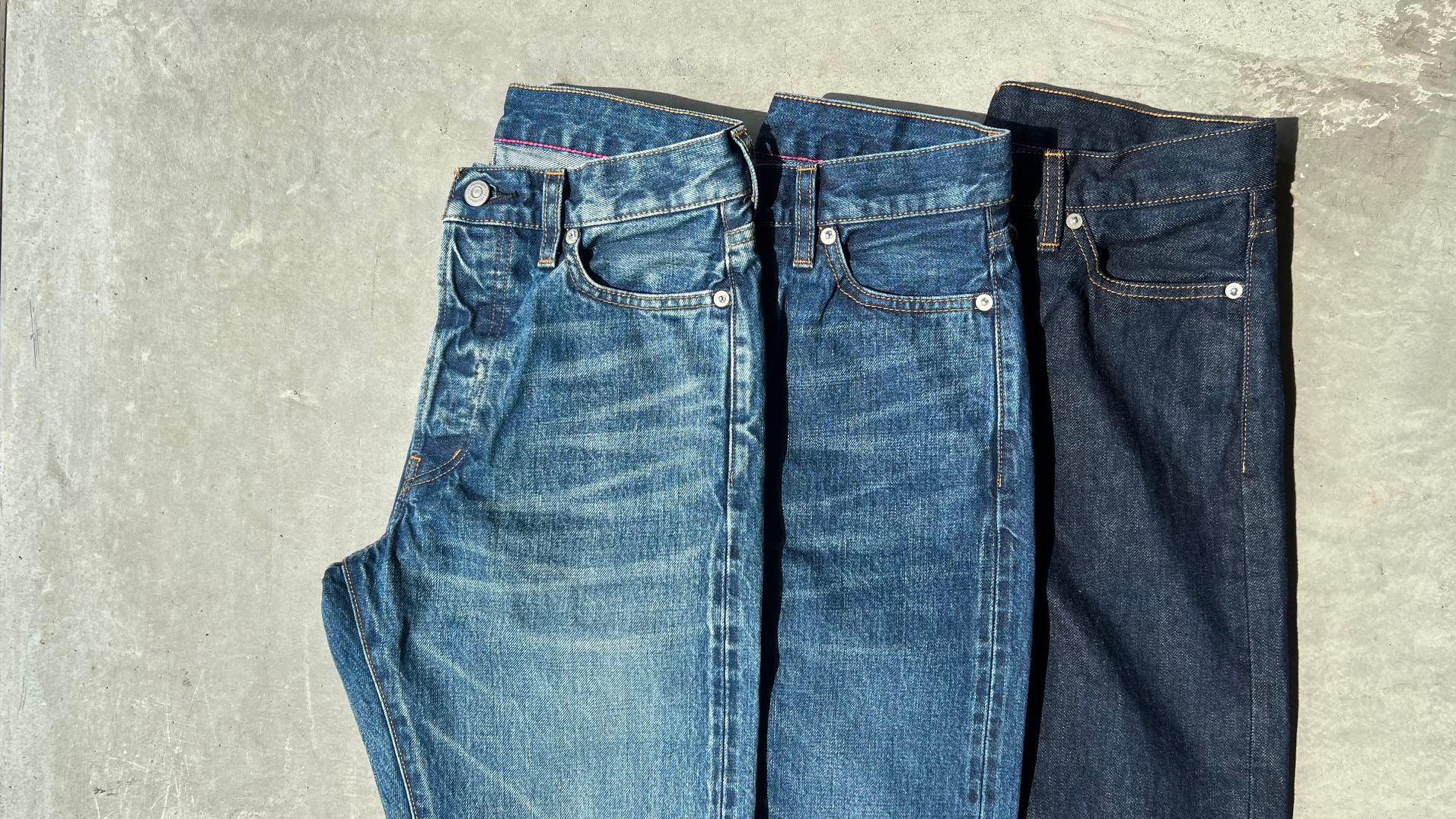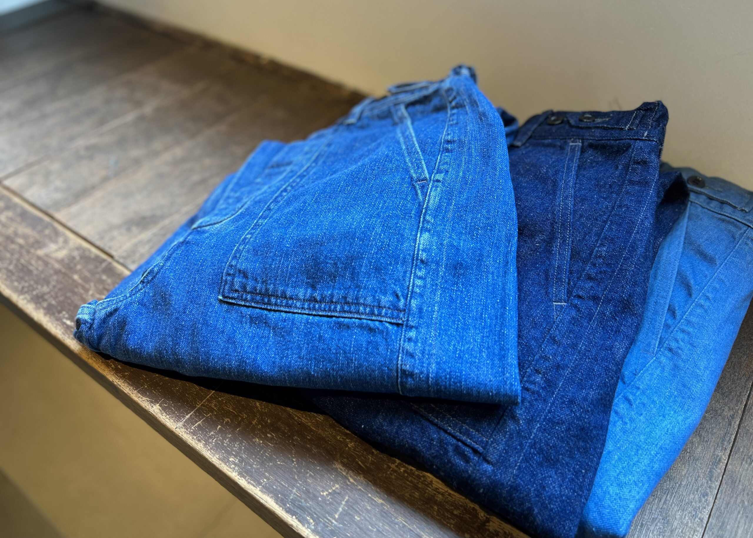 左からインディゴUSED、インディゴワンウォッシュ、やや明るめのブルー