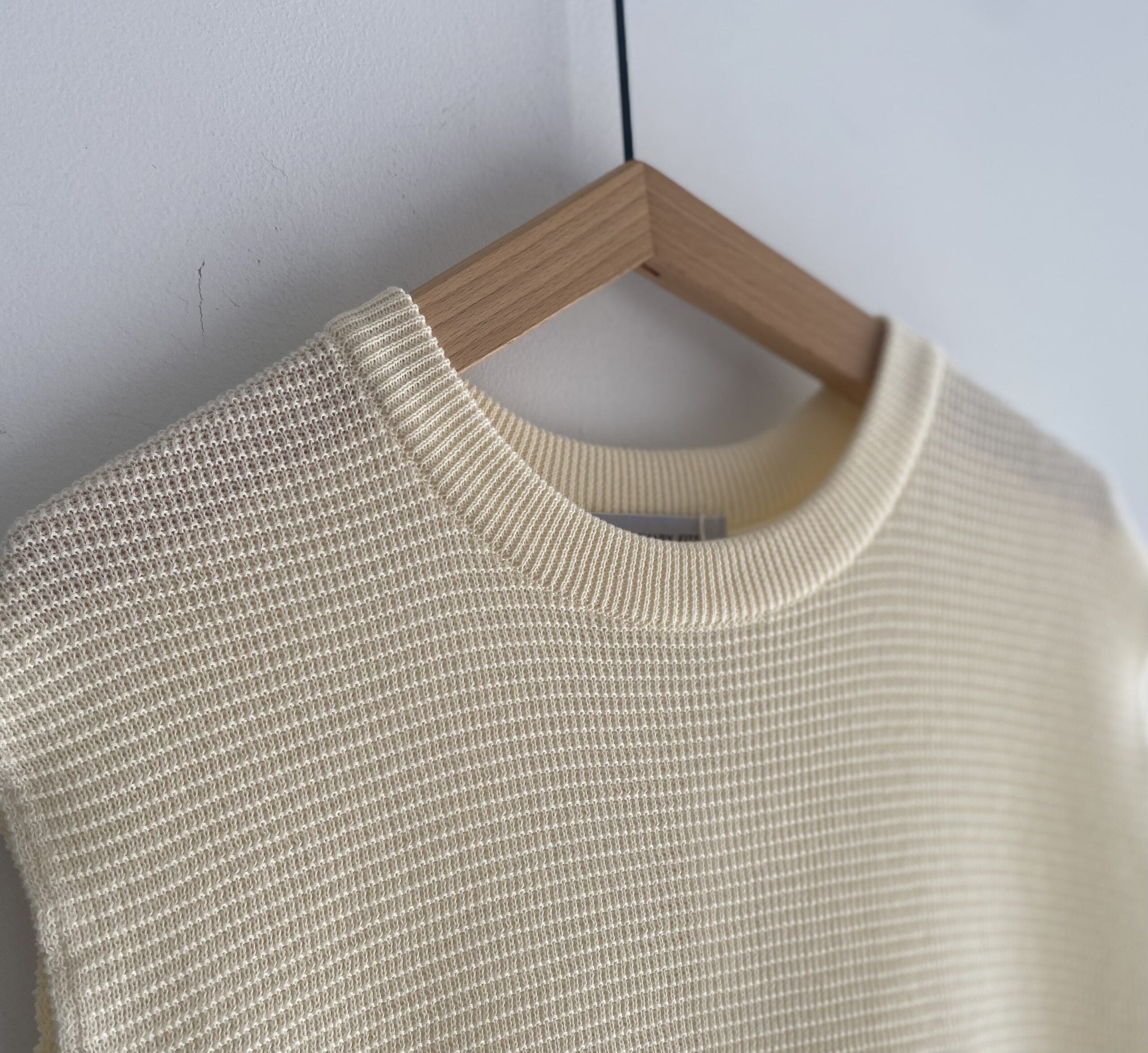 首元は少し詰まっており、肩のラインは落ち感があるシルエットです。